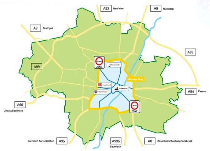Mnichov obdobně jako Berlín nejprve zavedl povinnost před vjezdem do ekologické zóny, kterou vytvořil 1. října roku 2008, označit vozidlo zelenou, žlutou nebo červenou plaketou. O dva roky později, tedy 1. října 2010 už muselo být každé vozidlo projíždějící tímto městem označenou jen zelenou nebo žlutou plaketou a od 10. ledna roku 2012 je povolen vjezd pouze automobilům se zelenou plaketou.