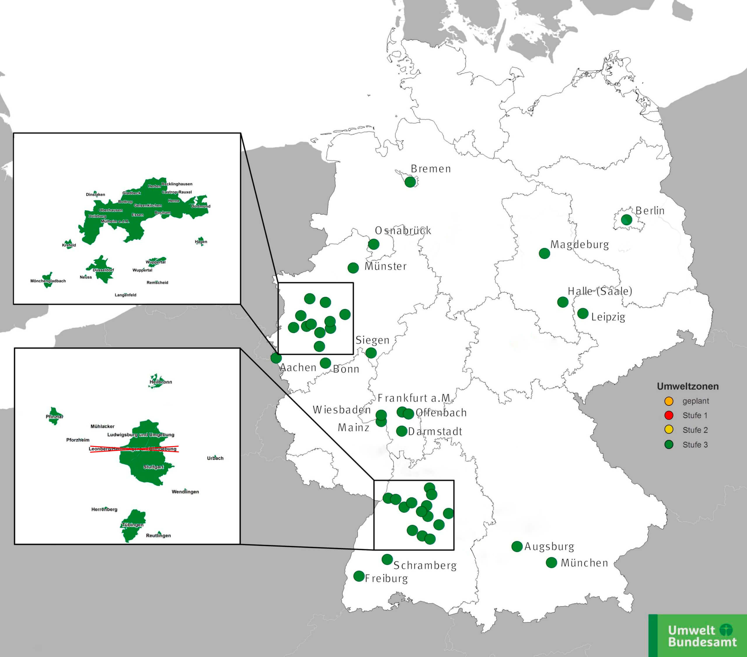 Povinnost opatřit vozidlo ekologickou známkou doposud zavedla následující německá města (tabulka uvádí také datum, od kterého povinnost pro dané město začala platit):