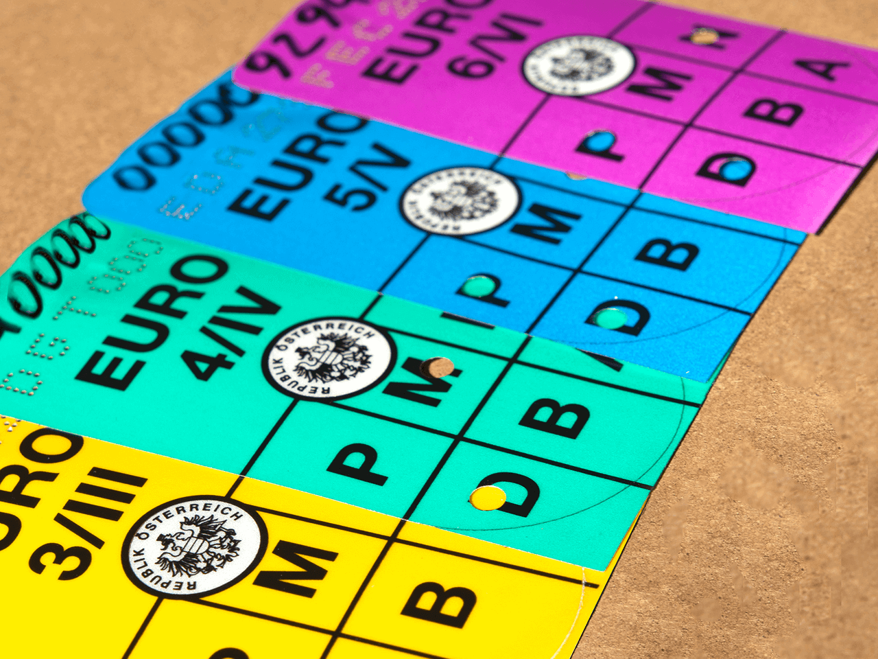 Rakousko rozlišuje šest úrovní znečišťování ovzduší. Pro Vaše vozidlo tak můžete získat jednu z šesti typů ekologických známek, která jej zařadí do určité emisní třídy.