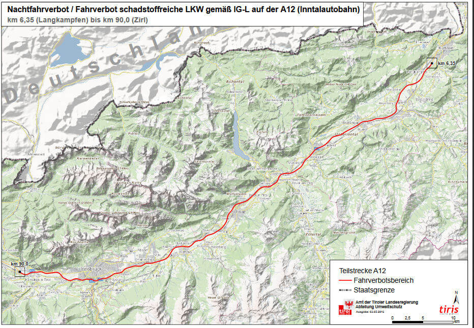 Omezení platí na úseku dálnice A12 mezi 6,35. kilometrem u obce Langkampfen a 90. kilometrem u obce Zirl v obou směrech a vztahují se kamiony/nákladní vozidla nad 7,5 tun.